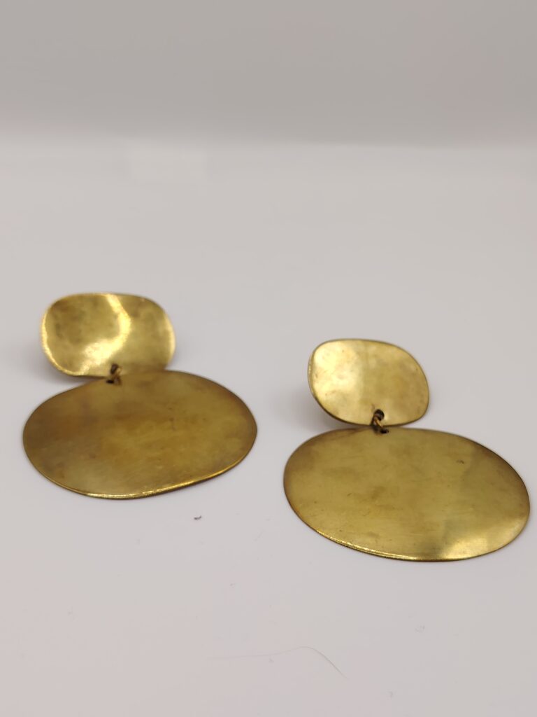 Ces boucles d’oreilles au design minimaliste et audacieux sont entièrement réalisées en laiton doré. Leur forme organique, composée de deux disques légèrement irréguliers, évoque à la fois simplicité et élégance naturelle.